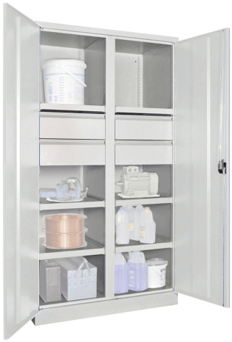 Schwerlastschrank, mit Trennwand, Bodentraglast 200 kg • Gehäusetraglast: 1300 kg • Mit Trennwand • Stahlblechkonstruktion: solide verschweißt, mit hochwertiger Pulverbeschichtung • Bodentraglast: 200 kg bei gleichmäßig verteilter Last • Traglast Schubladen: 60 kg bei gleichmäßig verteilter Last • Schubladen: kugelgelagert und mit integrierter Griffleiste • Türöffnungswinkel: 180° • Türen: mit Verstärkungstaschen • Sicherheit: Drehgriff mit 3-Punkt-Verriegelung und integriertem Zylinderschloss