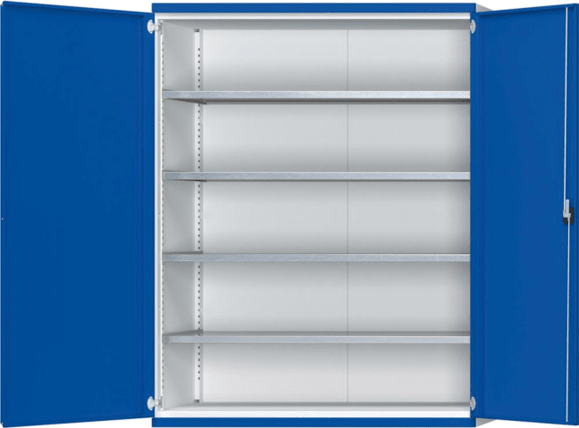 Schwerlastschrank, Breite 1485 mm • Gehäuse: Stahlblech • Türen: mit 3-Riegel-Sicherheitszylinderschloss • Türenöffnungswinkel: 270° • Lackierung: Gehäuse RAL 7035 lichtgrau, Fronten RAL 5010 enzianblau Lieferung: Inklusive Bodenverankerungen. • Einlegeböden: Tragkraft 160 kg, verzinkt