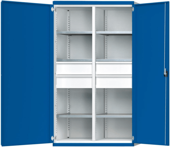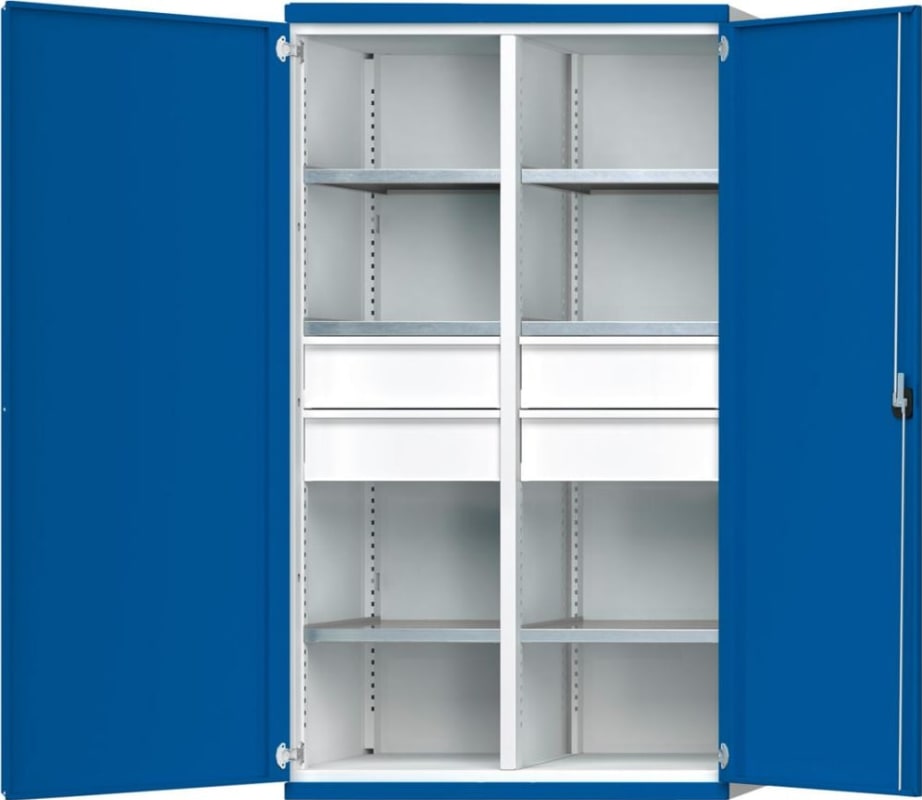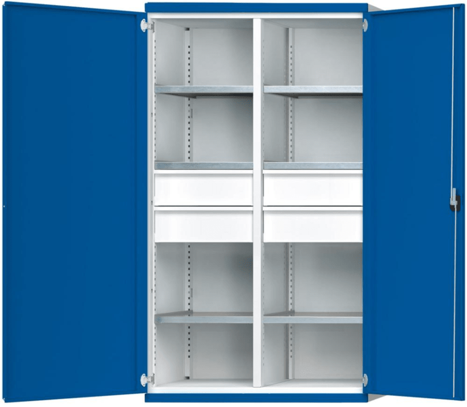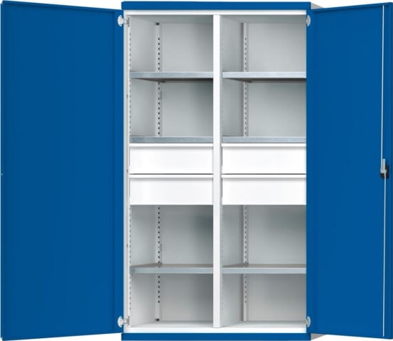 Schwerlastschrank, Breite 1085 mm • Gehäuse: Stahlblech • Türen: mit 3-Riegel-Sicherheitszylinderschloss • Türenöffnungswinkel: 270° • Lackierung: Gehäuse RAL 7035 lichtgrau, Fronten RAL 5010 enzianb