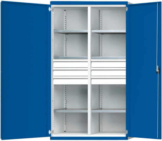Schwerlastschrank, Breite 1085 mm • Gehäuse: Stahlblech • Türen: mit 3-Riegel-Sicherheitszylinderschloss • Türenöffnungswinkel: 270° • Lackierung: Gehäuse RAL 7035 lichtgrau, Fronten RAL 5010 enzianb