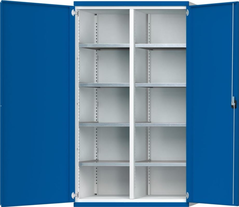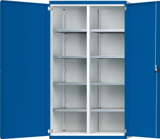 Schwerlastschrank, Breite 1085 mm • Gehäuse: Stahlblech • Türen: mit 3-Riegel-Sicherheitszylinderschloss • Türenöffnungswinkel: 270° • Lackierung: Gehäuse RAL 7035 lichtgrau, Fronten RAL 5010 enzianblau, weitere Farben in Ein- oder Zweifarblackierung ohne Aufpreis lieferbar (gemäß Farbleiste) • Einlegeböden: Tragkraft 160 kg, verzinkt