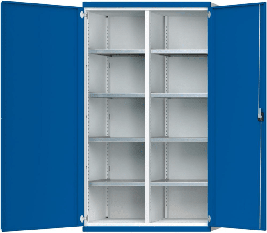 Schwerlastschrank, Breite 1085 mm • Gehäuse: Stahlblech • Türen: mit 3-Riegel-Sicherheitszylinderschloss • Türenöffnungswinkel: 270° • Lackierung: Gehäuse RAL 7035 lichtgrau, Fronten RAL 5010 enzianb