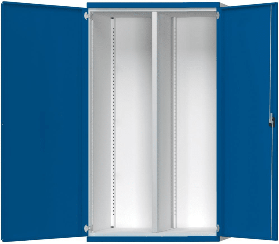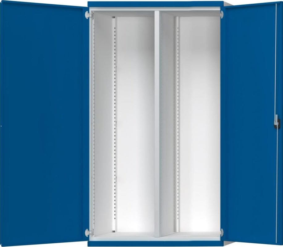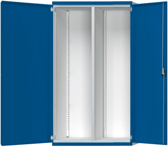 Schwerlastschrank, Breite 1485 mm • Gehäuse: Stahlblech • Türen: mit 3-Riegel-Sicherheitszylinderschloss • Türenöffnungswinkel: 270° • Lackierung: Gehäuse RAL 7035 lichtgrau, Fronten RAL 5010 enzianblau Lieferung: Inklusive Bodenverankerungen. • Leergehäuse mit Mittelwand