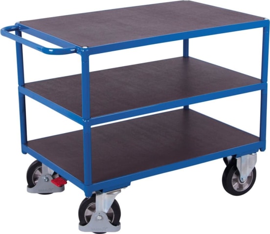 Schwerlast-Tischwagen, mit 3 Ladeflächen • Baukasten-System: Bodenkonstruktion innovatives Rahmenprofil, pulverbeschichtet in RAL 5010 enzianblau • Ladeflächen: Sperrholz, film-/siebdruck-beschichtet (Druckoberfläche oben), wasserdicht verleimt • Tragkraft obere/mittlere Ladefläche: 500 kg • Rollen: 2 Lenkrollen mit Rad-Feststeller, 2 Bockrollen • Reifen: Elastik-Vollgummi auf Alu-Druckguss-Felge • Naben: mit Präzisions-Rillenkugellager • EasySTOP-Bremssystem: serienmäßig Hinweis: Lenkrollen mit Radfeststeller und Fußschutz für Ihre Sicherheit.