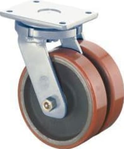 Schwerlast-Doppel-Lenkrolle S100.C10 • Kugellager im Gabelkopf und in den Rädern • Material Gehäuse: Stahlschweißkonstruktion, verzinkt • Material Radkörper: Guss • Material Lauffläche: Guss-Polyurethan 95 (± 3) Shore A