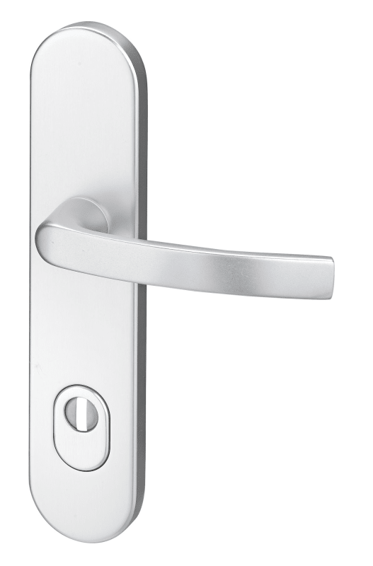 EDI, Profiltür-Schutz-Drückergarnitur, Abdeckung: Langschild, Modell: Uranus, Modellnummer: 2000/0064, Lochung: Profilzylinder gelocht, Entfernung: 92mm, Vierkant: 8mm, Material: Edelstahl, Farbton: edelstahl, Oberfläche: matt, DIN-Richtung: DIN Links-Rechts, Lagerung: festdrehbar, Ausführung: mit Zylinderabdeckung, Befestigungsart: verdeckt verschraubt, Befestigungstechnik: mit Stütznocken, Befestigungssystem: Stiftbefestigung, Breite: 54mm, Länge: 251mm, Anschlagrichtung: Drücker rechts/links verwendbar, Drückerbefestigung: Vollstift,Drückerform : gebogen, Form: oval, Schildstärke außen: 15mm, Schildstärke innen: 10mm, Türstärke min.: 65mm, Türstärke max.: 75mm, Türart: Rahmentüren,Türwerkstoff : Aluminium, Kunststoff, Widerstandsklasse: ES1, Qualitätsbezeichnung: Made in Germany