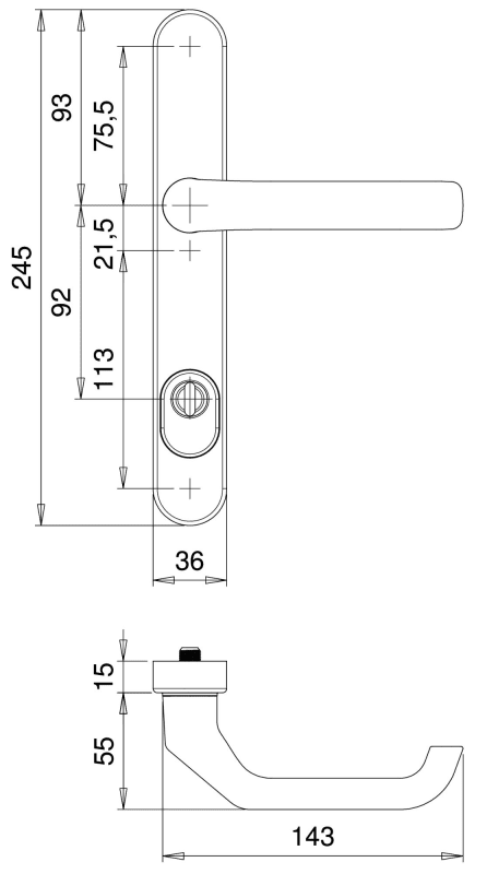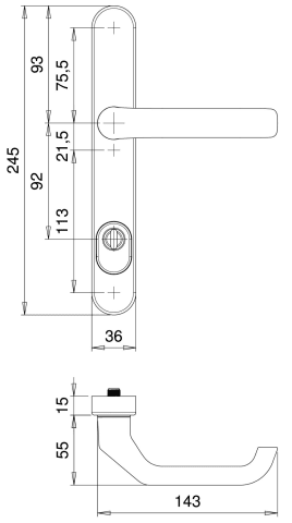 EDI, Profiltür-Schutz-Drücker-Halbgarnitur, Lochung: Profilzylinder gelocht, Entfernung: 92 mm, Vierkant: 8 mm, Modell: Kronos, Modellnummer: 1200/0145, Ergänzung: mit Zylinderabdeckung, Material: Alu