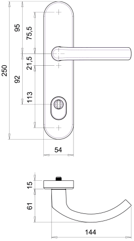 Dieckmann Alu-Schutz-Drücker-Garnitur, ES-1, Serie Logo, ovales Langschild 15mm, 92 ZA,, 8mm VKT, TS=65-75mm, 2200/2200,8956H F01, mit abgesetzten Stift 8/10