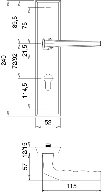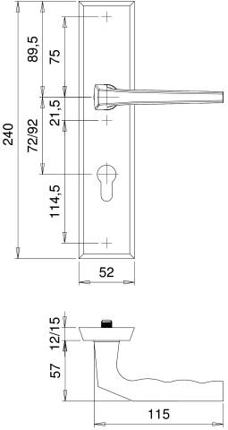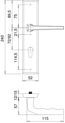 Schutz-Langschild-Drückergarnitur 8774H, PZ-gelocht, 92 mm Entfernung, Aluminium. Eigenschaften: • Material: Aluminium eloxiert • Drücker-Lagerung: lose • Stütznocken: M6, Ø 10 mm anbohrgeschützt • V