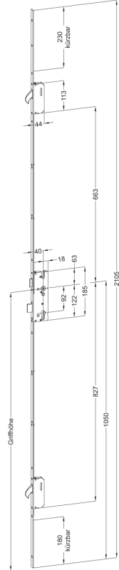 WINKHAUS, Objekttür-Mehrfachverriegelung, Lochung: Profilzylinder gelocht, Dornmaß: 40 mm, Entfernung: 92 mm, Drückernussvierkant: 8 mm, Stulpbreite: 16 mm, Stulpausführung: kantig, Stulpform: Flachstulp, Stulpeigenschaft: gerade, Stulplänge: 2105 mm, Stulpstärke: 3 mm, Modell: STV, Modellnummer: FG1660 M2, Ausführung: Drückerbetätigt, DIN-Richtung: DIN Links-Rechts, Einzelteilmaterial Stulp: Stahl, Farbton Stulp: chromatiert, Oberfläche Stulp: matt, Griffhöhe: 1050 mm, Anzahl Zusatzverriegelung: 2 St., Verriegelungsart: Schwenkriegel, Schlossklasse: Klasse 3, Riegelausschluss: 20 mm, Wechsel: ohne Wechsel, Funktion: Normalfunktion, Türart: Abschlusstür, Türflügelanzahl: einflügelig, zweiflügelig, Türausprägung: Türe gefälzt, Schlossriegel: 1 tourig, Einzelteilmaterial Falle: Stahl, Falleneigenschaft: mit umstellbarer Falle LS/RS, Einzelteilmaterial Riegel: Stahl, Riegeleigenschaft: Standard, Einzelteilmaterial Verriegelungen: Stahl, Drückernuss: Standard, Einzelteilmaterial Drückernuss: Stahl, Schlosskasten: geschlossen, Einzelteilmaterial Schlosskasten: Stahl, Oberfläche Schlosskasten: verzinkt, Schlosskastenlänge: 185 mm, Schlosskastenbreite: 55 mm, Norm: DIN 18251, Türwerkstoff: Holz, Aluminium, Kunststoff, Flügelfalzhöhe min.: 1875 mm, Flügelfalzhöhe max.: 2230 mm