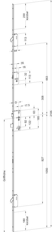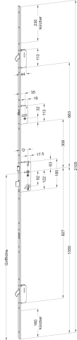 WINKHAUS, Objekttür-Mehrfachverriegelung, Lochung: Profilzylinder gelocht, Dornmaß: 35 mm, Entfernung: 92 mm, Drückernussvierkant: 8 mm, Stulpbreite: 24x6 mm, Stulpausführung: kantig, Stulpform: U-Stulp, Stulpeigenschaft: gerade, Stulplänge: 2105 mm, Stulpstärke: 3 mm, Modell: STV, Modellnummer: UW2460 M2, Ausführung: Schlüsselbetätigt, DIN-Richtung: DIN Links-Rechts, Einzelteilmaterial Stulp: Edelstahl, Farbton Stulp: edelstahl, Oberfläche Stulp: gebürstet, Ergänzung: mit Türwächter, Griffhöhe: 1050 mm, Anzahl Zusatzverriegelung: 2 St., Verriegelungsart: Schwenkriegel, Schlossklasse: Klasse 3, Riegelausschluss: 20 mm, Wechsel: mit Wechsel, Funktion: Normalfunktion, Türart: Abschlusstür, Türflügelanzahl: einflügelig, zweiflügelig, Türausprägung: Türe stumpf, Schlossriegel: 2 tourig, Einzelteilmaterial Falle: Stahl, Falleneigenschaft: mit umstellbarer Falle LS/RS, Einzelteilmaterial Riegel: Stahl, Riegeleigenschaft: Standard, Einzelteilmaterial Verriegelungen: Stahl, Drückernuss: Standard, Einzelteilmaterial Drückernuss: Stahl, Schlosskasten: geschlossen, Einzelteilmaterial Schlosskasten: Stahl, Oberfläche Schlosskasten: verzinkt, Schlosskastenlänge: 185 mm, Schlosskastenbreite: 49,5 mm, Norm: DIN 18251, Türwerkstoff: Holz, Aluminium, Kunststoff, Flügelfalzhöhe min.: 1875 mm, Flügelfalzhöhe max.: 2230 mm