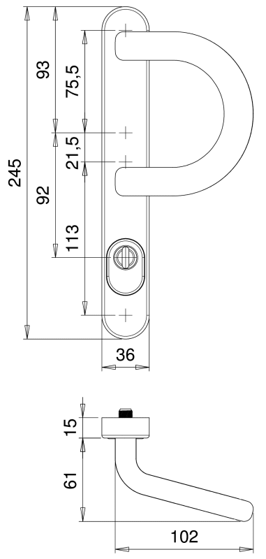 EDI, Profiltür-Schutz-Wechselgarnitur, Abdeckung: mit Langschild, Modell: Kronos,Modellnummer: 1300/1045, Lochung: Profilzylinder gelocht, Entfernung: 92mm, Vierkant: 8mm, Material: Aluminium, Farbton: naturfarbig, Oberfläche: eloxiert, DIN-Richtung: DIN Links-Rechts, Lagerung: Rückholfeder, festdrehbar, Befestigungsart: verdeckt verschraubt, Befestigungstechnik: mit Stütznocken, Befestigungssystem: Stiftverbindung, Ergänzung: mit Zylinderabdeckung, mit Griff B1, Eigenschaft: Stoßgriff fest auf Schild, Breite: 36mm, Länge: 245mm, Stoßgriffform: Halbkreis, Stoßgriffbreite: 94mm, Stoßgriffhöhe: 72mm, Anschlagrichtung: Drücker rechts/links verwendbar, Drückerbefestigung: Vollstift,Drückerform : gekröpft, U-Form, Form: oval, Schildstärke außen: 15mm, Schildstärke innen: 10mm, Türart: Rahmentüren,Türwerkstoff : Aluminium, Kunststoff