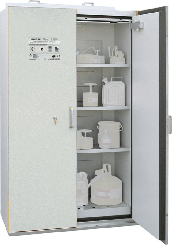 Gefahrstoffschrank Typ 90 • Außenkorpus: Stahlblech, pulverbeschichtet • Innenkorpus: aus HPL-beschichteten Platten, RAL 7035 lichtgrau • Bodenabschlussschiene: aus Edelstahl, Niro Raute • Einlegeböden: im Raster von 64 mm höhenverstellbar • Im Brandfall automatische Selbstschließung über Thermomechanik: Tür bei Temperaturanstieg auf 90 Minuten.