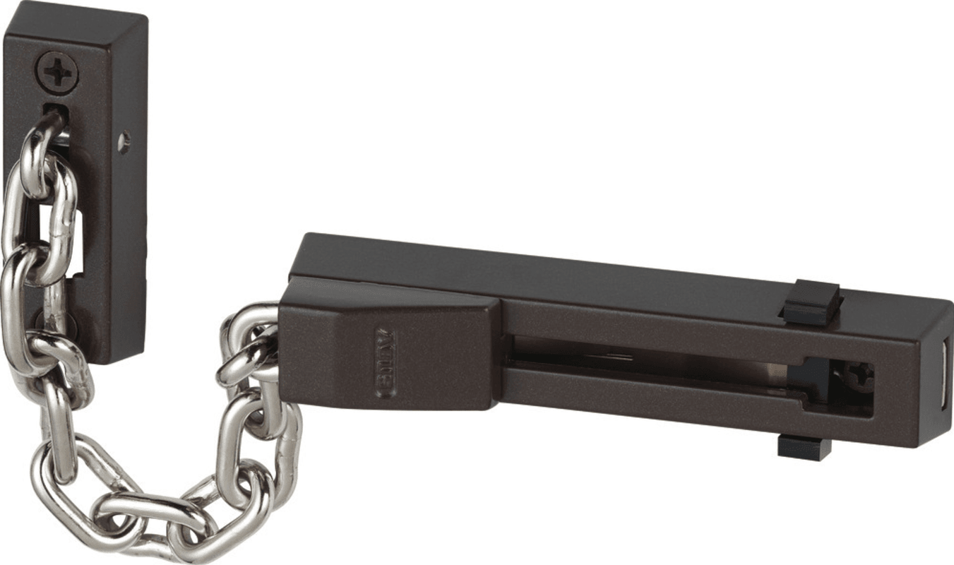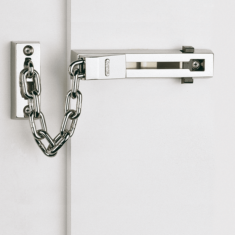 Formschöne Türkette. Einsatz und Anwendung: Für Haus-Eingangstüren und Wohnungs-Abschlusstüren. Technik und Ausstattung: Gehärtete Stahlkette. Kindersicherung: Die Schiene ist mit einer gefederten Sperre ausgestattet. Integrierte Kettenhalterung. ABUS Level 4.