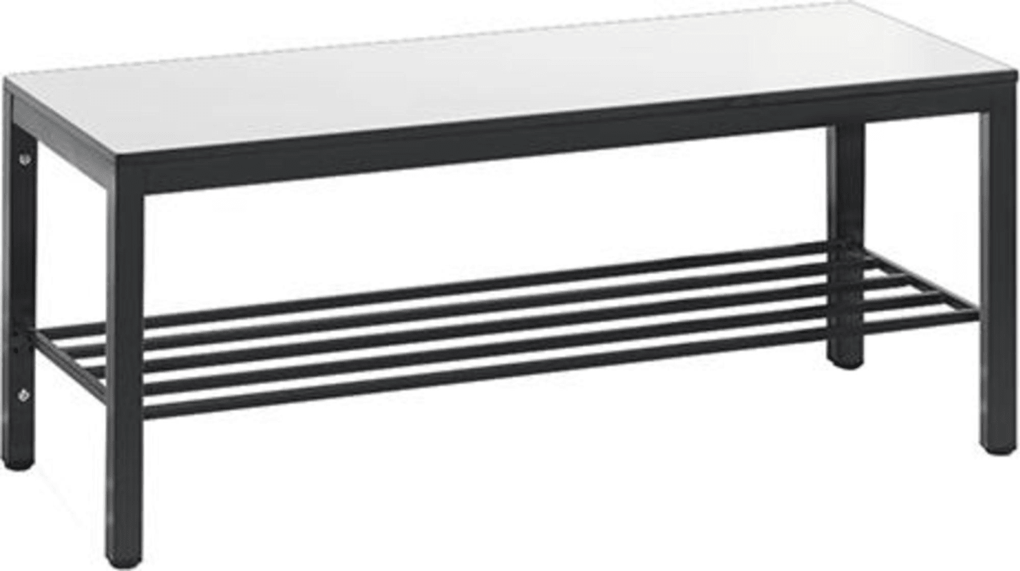 Sitzbank, mit Schuhrost • Stabile 4-kant-Rohr-Konstruktion aus Stahl, 30 x 30 mm • Gestell und Schuhrost: elektrolytisch verzinkt, hochwertig einbrennbeschichtet • Sitzfläche: Vollkernplatte (HPL) 13