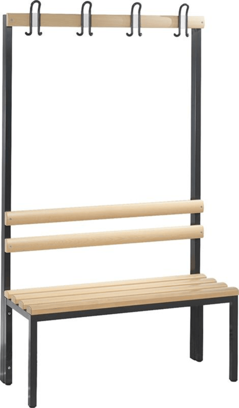 Einseitige Garderobenbank, Holzleisten • Sitzfläche aus Hartholz • Einseitig • Gestell: 4-kant-Stahlrohr 30 x 30 mm, höhenverstellbare Kunststoff-Füße • Sitzfläche, Rückenlehnen, Hakenleisten: Hartholz-Leisten, gerundet, allseits gehobelt, klar lackiert, mit natürlichen Farbunterschieden • Hakenleisten: mit Kunststoff-Doppelkleiderhaken, verdeckt nach DIN • Auf Anfrage: Höhenverstellschrauben bis 50 mm • Lackierung: Gestell RAL 7021 schwarzgrau Lieferung: Komplett montiert.