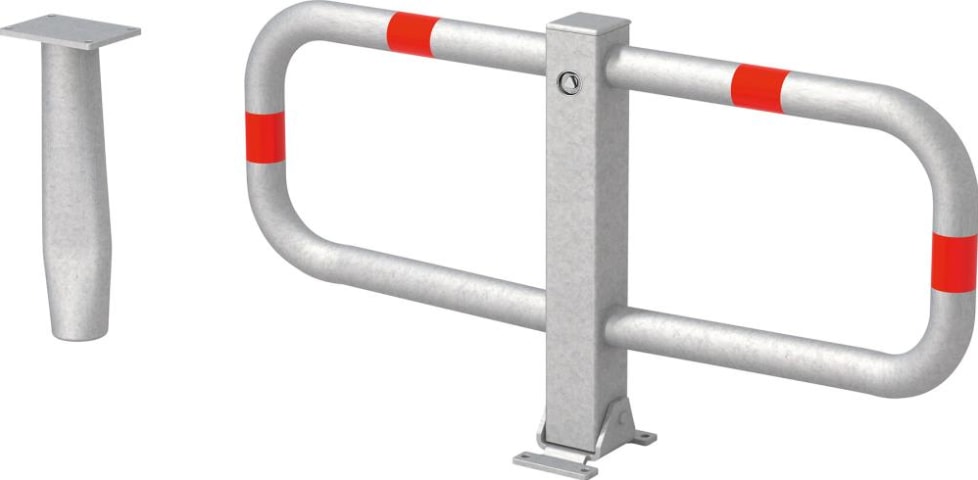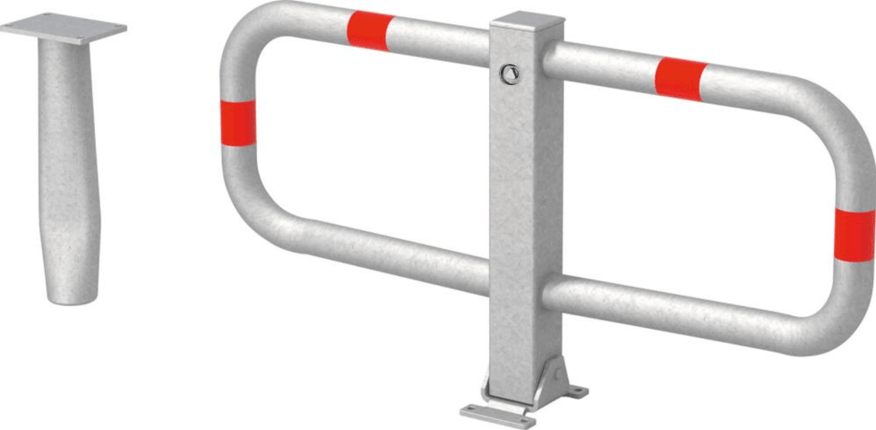 Parkplatzbügel Modell STOPPY I • Material: Stahl feuerverzinkt, mit 4 rot reflektierenden Ringen • Pfostenstärke: 70 x 70 mm • Höhe: 450 mm • Umlegbar • Verschlusssystem: Dreikantverschluss (nicht in