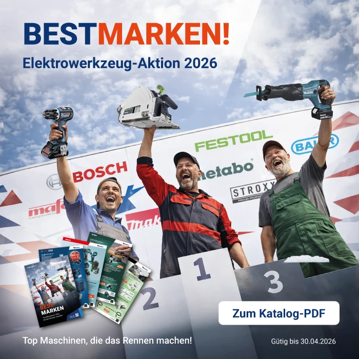 Unsere Top-Marken 2026! In dieser Aktion vereinen wir führende Werkzeugmarken, denen Profis seit Jahren vertrauen. Dazu gehören unter anderem Bosch Professional, Makita, Festool, Metabo, Mirka, Freud, Baier, Stroxx, blaugelb und BEA. Alle Produkte sind konsequent auf die Anforderungen von Handwerksbetrieben, Verarbeitern und Montageprofis ausgelegt – für effizientes Arbeiten, hohe Qualität und zuverlässige Ergebnisse im täglichen Einsatz.