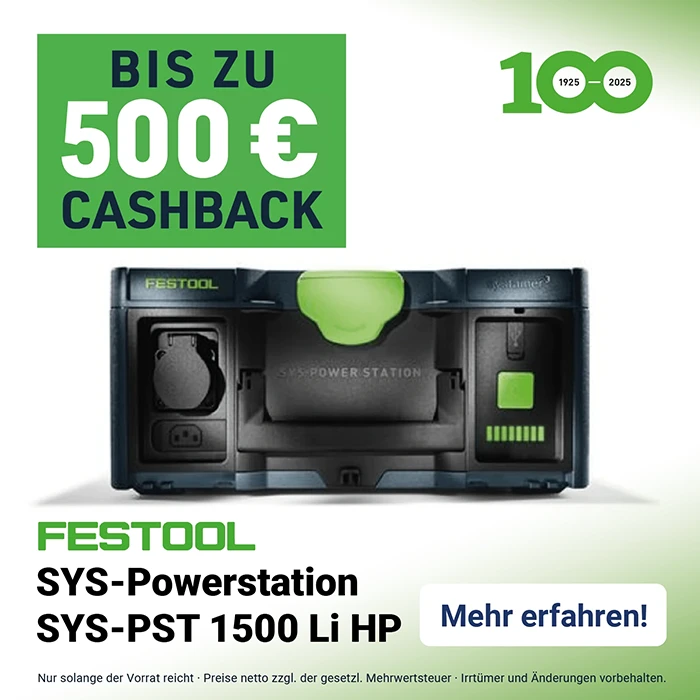 Auch der Cashback für die Festool SYS-Powerstation SYS-PST 1500 Li HP ist bis 30.11.2025 gültig – mit 500,00 € Rückvergütung.