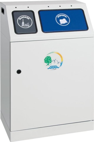 Wertstoffsammler Sortsystem Duplex • Material: Stahlblech, verzinkt • Oberfläche: pulverbeschichtet, strukturiert RAL 7035 lichtgrau • Schließung: 4-kant-Schloss, Schlüssel im Lieferumfang enthalten