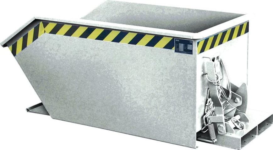 Späne-Kippbehälter, Typ SGU, mit Lochblechboden • Wanne: aus Stahlblech, Öl- und wasserdicht verschweißt mit umlaufendem Randprofil • Grundrahmen: aus Stahl mit Einfahrtaschen • Geschraubtes Lochblech: 100 mm oberhalb vom Boden, Loch-Ø 3 mm, Teilung 6 mm, Ablasshahn 1" zum Ablassen der Flüssigkeiten • Kippen in jeder Höhe per Seilzug vom Staplersitz • Sicherung gegen unbeabsichtigtes Abrutschen und Abkippen Hinweis: Geeignet zum Sammeln und Trennen der Flüssigkeit von Feststoffen.