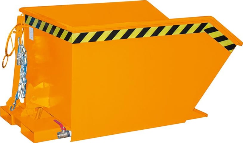 Späne-Kippbehälter, Typ SGU, mit Lochblechboden • Wanne: aus Stahlblech, Öl- und wasserdicht verschweißt mit umlaufendem Randprofil • Grundrahmen: aus Stahl mit Einfahrtaschen • Geschraubtes Lochblech: 100 mm oberhalb vom Boden, Loch-Ø 3 mm, Teilung 6 mm, Ablasshahn 1" zum Ablassen der Flüssigkeiten • Kippen in jeder Höhe per Seilzug vom Staplersitz • Sicherung gegen unbeabsichtigtes Abrutschen und Abkippen Hinweis: Geeignet zum Sammeln und Trennen der Flüssigkeit von Feststoffen.