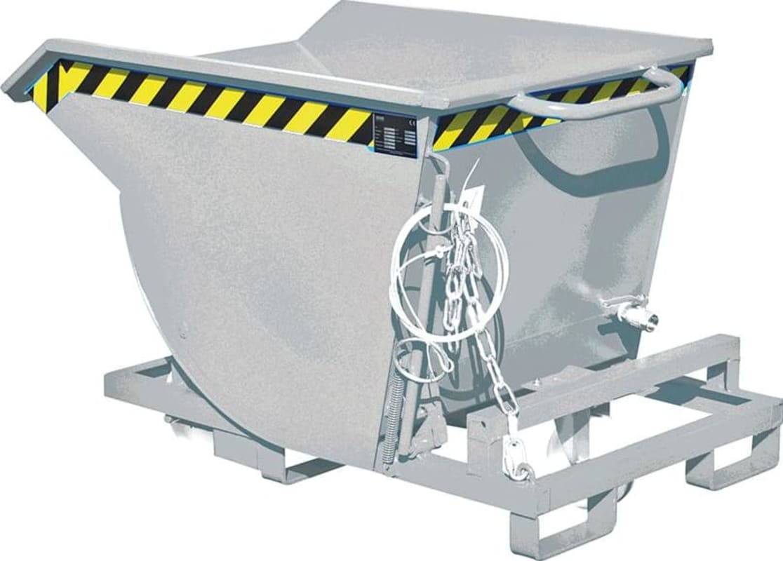 Späne-Kippbehälter, Typ SKM, mit Siebblecheinsatz • Wanne: aus Stahlblech, Öl- und wasserdicht verschweißt mit umlaufendem Randprofil • Grundrahmen: aus Stahl mit Einfahrtaschen • Kippen in jeder Höhe per Seilzug vom Staplersitz aus möglich • Siebblech: Ablasshahn 1" zum Ablassen der Flüssigkeiten • Günstiger Lastschwerpunkt • Sicherung gegen unbeabsichtigtes Abrutschen und Abkippen