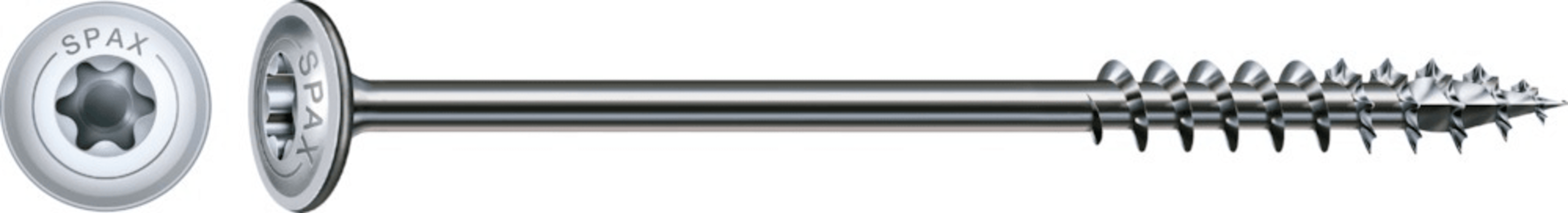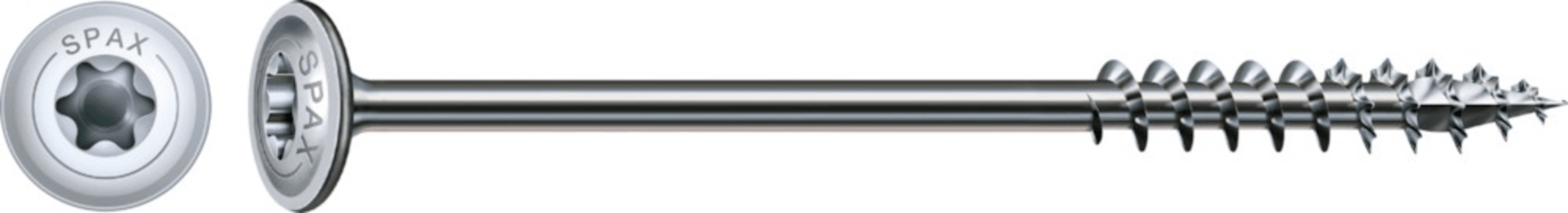 Die Holzbauschraube von SPAX mit Tellerkopf, T-STAR plus Antrieb und Teilgewinde. Die 50 Tellerkopfschrauben mit korrosionsbeständiger WIROX Beschichtung und 4CUT Spitze garantieren schnelles und sich