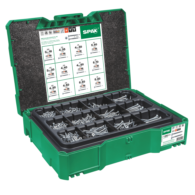 Box systainer T-loc³ I, Schraubenset mit 12 Abmessungen, Senkkopf, T-STAR plus, 4CUT, WIROX Ein komplettes Schraubenset mit 1.380 Schrauben in 12 Abmessungen beherbergt unser SPAX Box systainer. Die m