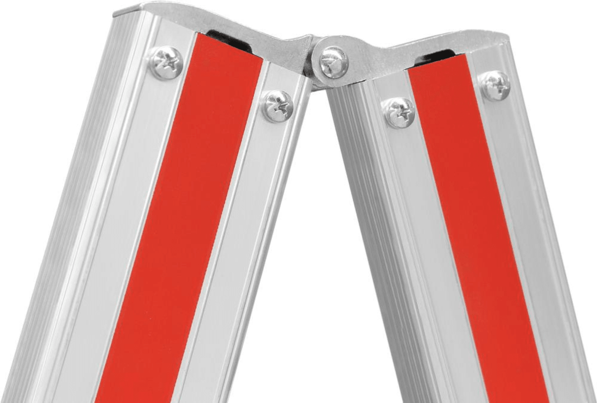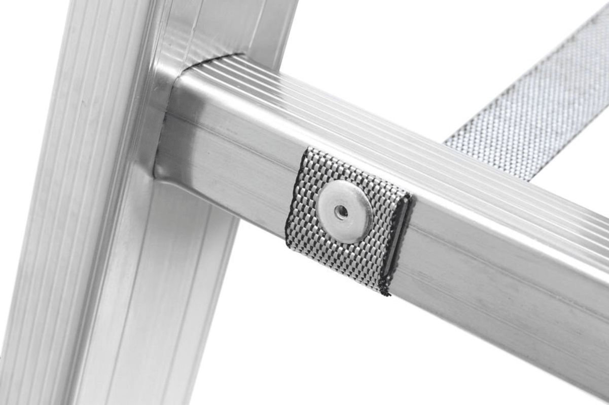 Sprossenstehleiter, beidseitig begehbar • Material: Aluminium • Sprossen: aus Walzprofil • Aluminium-Scharniere, verschraubt, auswechselbar • Spreizsicherung durch hochfeste Perlongurte, 25 mm breit • Leiterfüße mit Holm verpresst