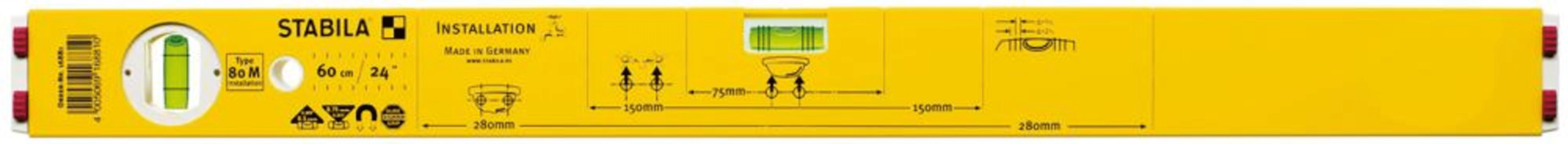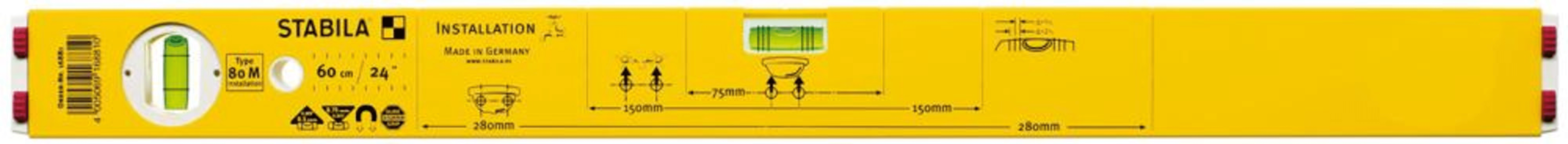 Wasserwaage Type 80 M Installation• Aluminium-Rechteckprofil • Mit 1 Horizontal- und 1 Vertikallibelle • 6-Ring-Horizontal-Libelle: Für das Anlegen von 1 % und 2 % Gefälle • Mit extrastarken Selten