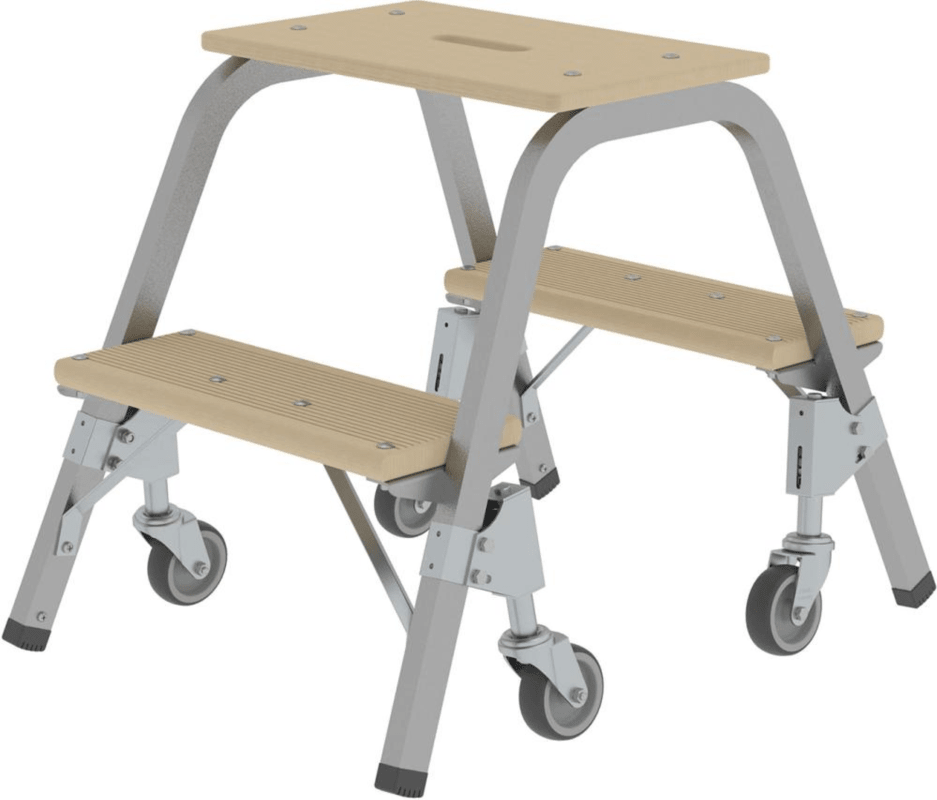 Stahl-Holz-Tritt mit Brems-Lenkrollen • Holme: Stahl, pulverbeschichtet RAL 7023 grau • Deckbrett: mit Grifföffnung • Stufentiefe: 150 mm, lasiert • Mit rutschfesten Leiterschuhen • Brems-Lenkrollen: