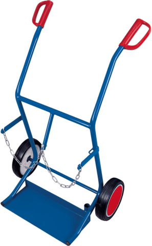 Stahlflaschen-Karre für 2 Flaschen à 20 l Inhalt • Stahlrohr-Konstruktion: geschweißt, pulverbeschichtet in RAL 5010 enzianblau • Flaschen-Halterung: mit Ketten-Sicherung • Naben: mit Präzisions-Rill