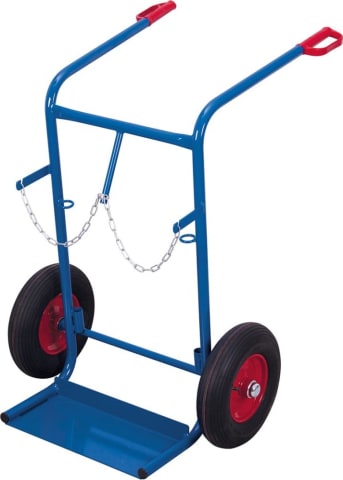 Stahlflaschen-Karre für 2 Flaschen à 40–50 l • Stahlrohr-Konstruktion: geschweißt, pulverbeschichtet • Flaschen-Halterung: mit Ketten-Sicherung • Naben: Präzisions-Rillenkugellager • Griffe: Sicherheitsgriffe mit Hand-Einfassung • Köcher: für Schweißdraht Hinweis: Zum Transport von 2 Stahlflaschen à 40–50 l Inhalt, Ø 210–250 mm.