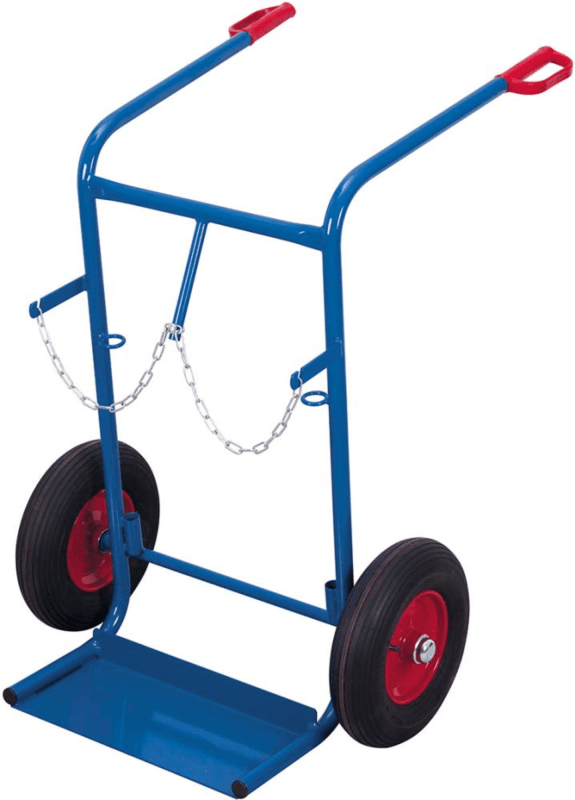 Stahlflaschen-Karre für 2 Flaschen à 40–50 l • Stahlrohr-Konstruktion: geschweißt, pulverbeschichtet • Flaschen-Halterung: mit Ketten-Sicherung • Naben: Präzisions-Rillenkugellager • Griffe: Sicherhe