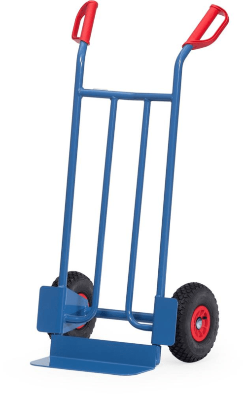 Stahlrohrkarre (Sack- und Stapelkarre) • Stahlrohr-Konstruktion: geschweißt, pulverbeschichtet in RAL 5007 brillantblau • Schaufel: Stahlblech, zum Anschrauben, austauschbar • Griffe: Sicherheitsgrif
