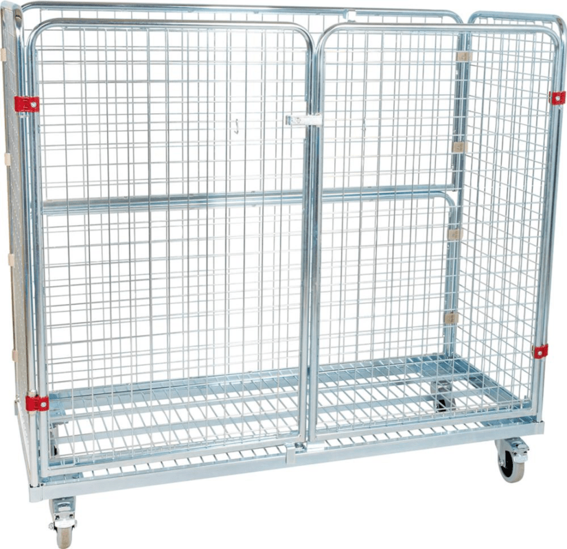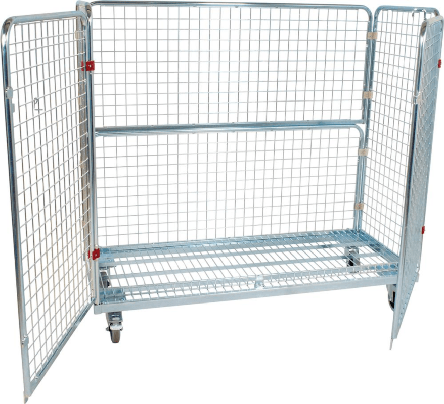 Stahlrollbehälter • Rohroberfläche: galvanisch verzinkt, besonders glatt, extrem widerstandsfähig • Rohr-Ø: 22 mm • Drahtgitter: Fahrrahmen aus Rechteckrohr 40 x 20 mm • Zwischenboden: lose einhängbar • Rollen: 4 Lenklrollen, zwei mit Feststeller • Reifen: Polyamid, Ø 125 mm mit, Lauffläche aus Elastikgummi 2 Seitenwände, 1 Rückwand, 1 abschließbare Flügeltür