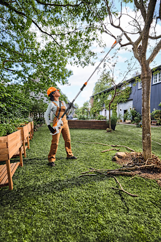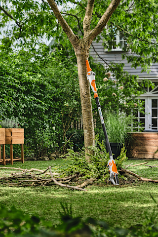 Der ergonomisch gestaltete, intuitiv bedienbare Akku-Hochentaster STIHL HTA 30 ermöglicht ambitionierten Privatpersonen bei der Grundstücks-, Garten- und Baumpflege ein effizientes und komfortables Arbeiten. Dank werkzeuglos verstellbarem, führungssteifem Teleskopschaft und automatischer Kettenspannung mit integriertem Federmechanismus bietet Ihnen der STIHL HTA 30 beim Rückschnitt hoher Äste, aber auch bei der Gehölzpflege und beim Beseitigen von Totholz eine effiziente Unterstützung. Die Kettenspannung lässt sich mit einem Handgriff durch einfaches Öffnen und Schließen des Kettenraddeckels auf die optimale Spannung anpassen schnell und intuitiv für minimale Unterbrechungen bei der Arbeit. Der im Asthaken integrierte Spannhebel sorgt für die richtige Kettenvorspannung und erleichtert so die schnelle, werkzeuglose Montage der Schneidgarnitur nach der Reinigung oder dem Kettenwechsel. Der Spannhebel und alle anderen Bedienelemente des HTA 30 sind auch mit Arbeitshandschuhen gut bedienbar.