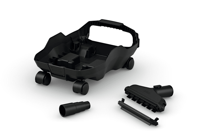 Zum Lieferumfang des Fahrwagens gehören ein Adapter für Elektrowerkzeuge und eine Bodendüse mit 2 Einsätzen: ein Bürsteneinsatz für trockene Oberflächen und ein Einsatz mit Gummilippe für nasse, glatte Oberflächen. Bodendüse, Einsätze und Adapter können platzsparend im Fahrwagen verstaut werden und sind so jederzeit griffbereit.