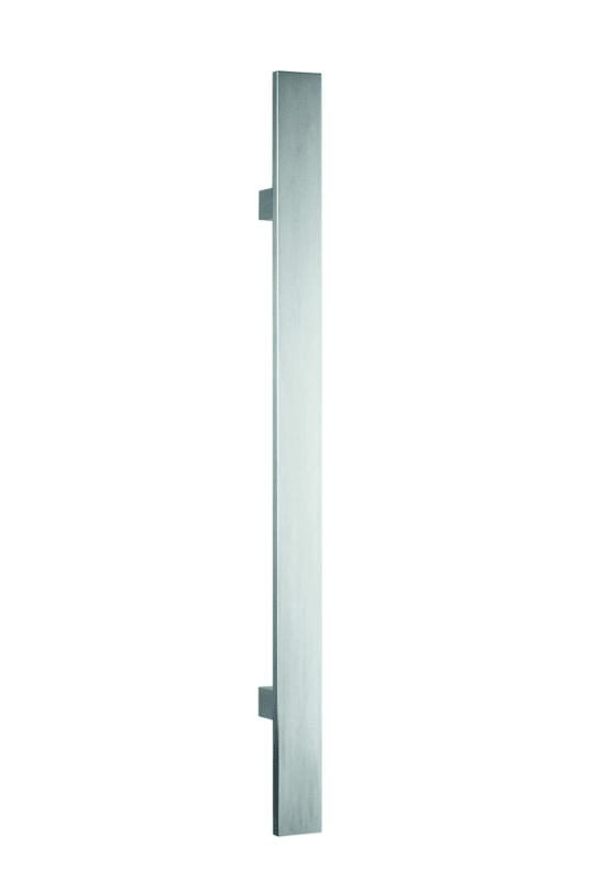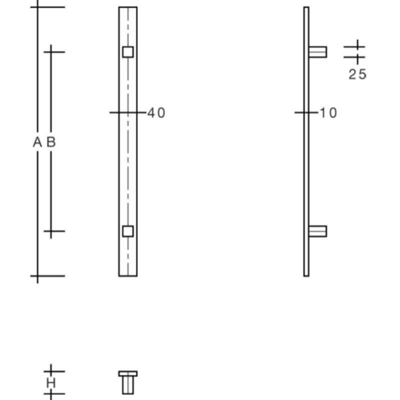 Griff aus Edelstahl, feinmatt poliert, Profil 40x10 mm, Höhe (H) 50 mm, mit geraden Stützen 25x25 mm (ab 1.200 mm incl. 3. Stütze).