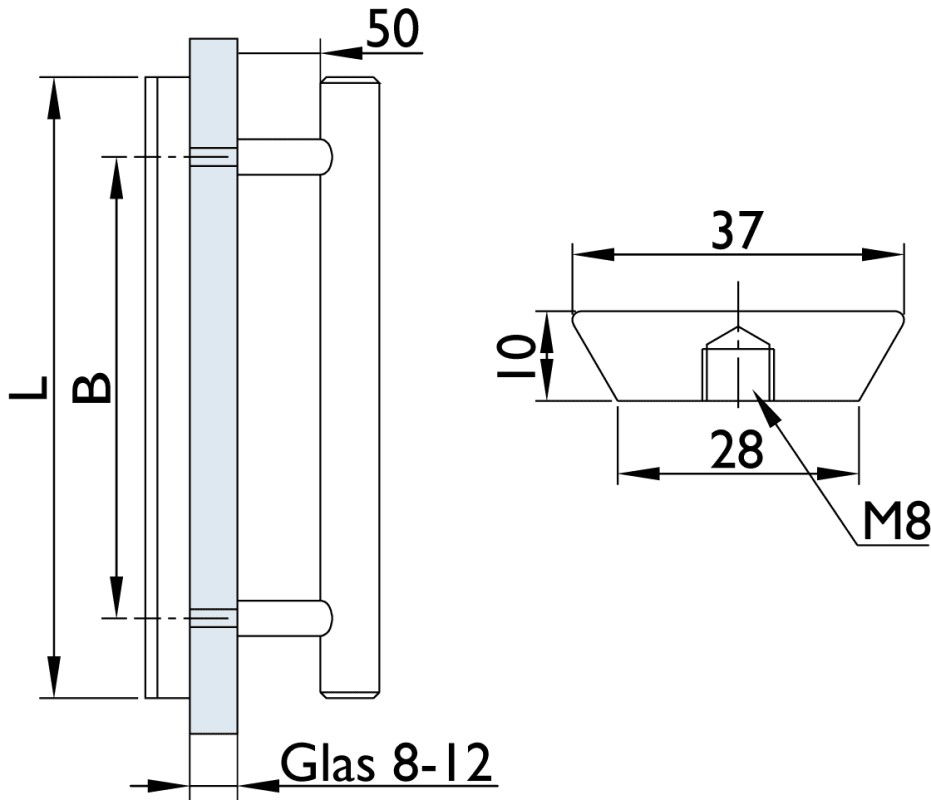 8086 - Stoßgriff / Griffleiste - SET, mit Stoßgriff 8500 Ø25/300/200, mit Flachgriff aus Aluminium, Länge 300 mm, inkl. paarweiser Befestigung an Glas 8 - 12 mm, Oberfl. 60/F9 (Edelstahl matt/Edelstahlfarben)