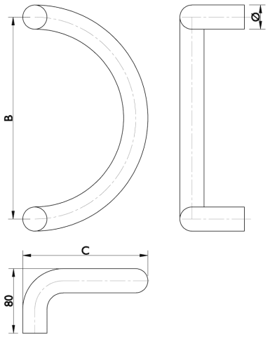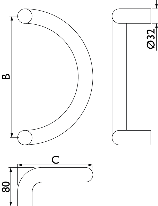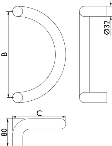 Stoßgriff Serie 8043 Halbrund, Durchmesser 32 mm / Achsmaß 300, Ausladung 225 mm, inkl. einseitiger Befestigung, Oberfl. 60 (Edelstahl matt)