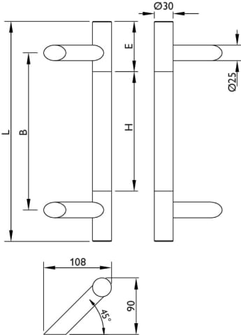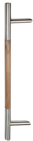 Stoßgriff Serie 8010 Holz Ø 30 mm, Länge 1200 mm, Achsmaß 1000 mm, 2 schräge Stützen, inkl. einseitiger Befestigung, Holzeinsatz 900 mm Länge, Oberfl. 60/EI (Edelstahl matt/Nussbaum natur)