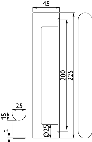 Stoßgriff Serie 8013 / Profil 25 x 15 mm halbrund, Länge 225 mm, Achsmaß 200 mm, mit Klebeplatte 225 x 25 mm, inkl. Montagehilfe für Verklebung, Oberfl. 74 (Classic Black, ähnl. RAL 9005)
