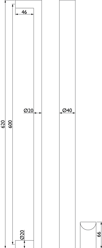 Stoßgriff Serie 8014 / Profil 40 x 20 mm halbrund, Länge 620 mm, Achsmaß 600 mm, inkl. einseitiger Befestigung, Oberfl. 60 (Edelstahl matt)