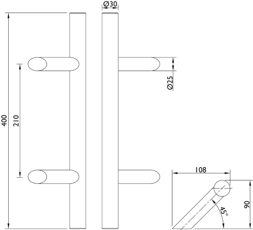 Stoßgriff Serie 8010 Ø 30 mm, Länge 400 mm, Achsmaß 210 mm, 2 schräge Stützen, inkl. einseitiger Befestigung, Oberfl. 60 (Edelstahl matt)
