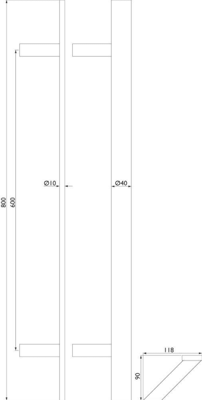 Stoßgriff Serie 8022 SL gk / 40 x 10 mm gerade, Länge 800 mm, Achsmaß 600 mm, 2 schräge Stützen 90mm inkl. PVC U-Scheiben, inkl. einseitiger Befestigung, Oberfl. 60 (Edelstahl matt)