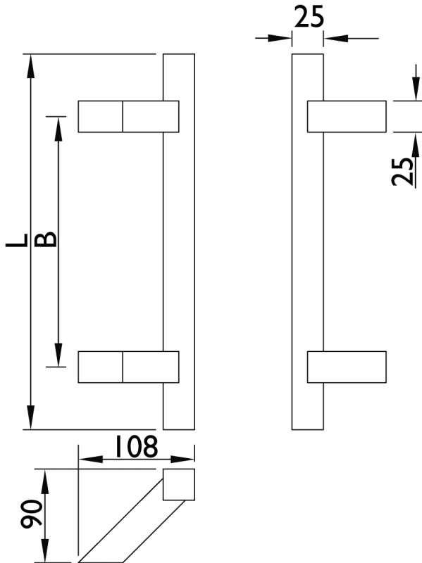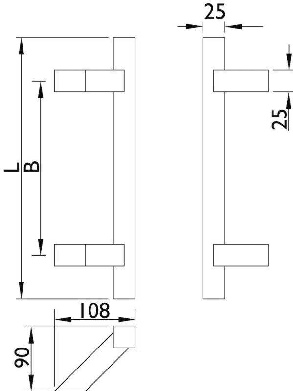 Stoßgriff Serie 8031 SL gk / 25 x 25 mm Vierkant, Länge 600 mm, Achsmaß 400 mm, Höhe 90 m, 2 schräge Stützen inkl. Kunststoff-U-Scheiben, inkl. einseitiger Befestigung, Oberfl. 60 (Edelstahl matt)