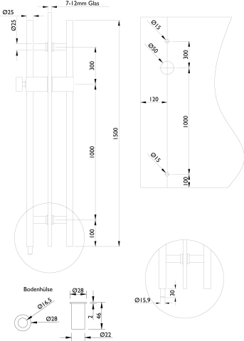 Stoßgriffpaar 8000 PZ abschließbar, Ø 25 mm / für 8/10 mm Glas, Länge 1500 mm, Innen Knauf / Außen Halbzylinder, Oberfl. 60 (Edelstahl matt)