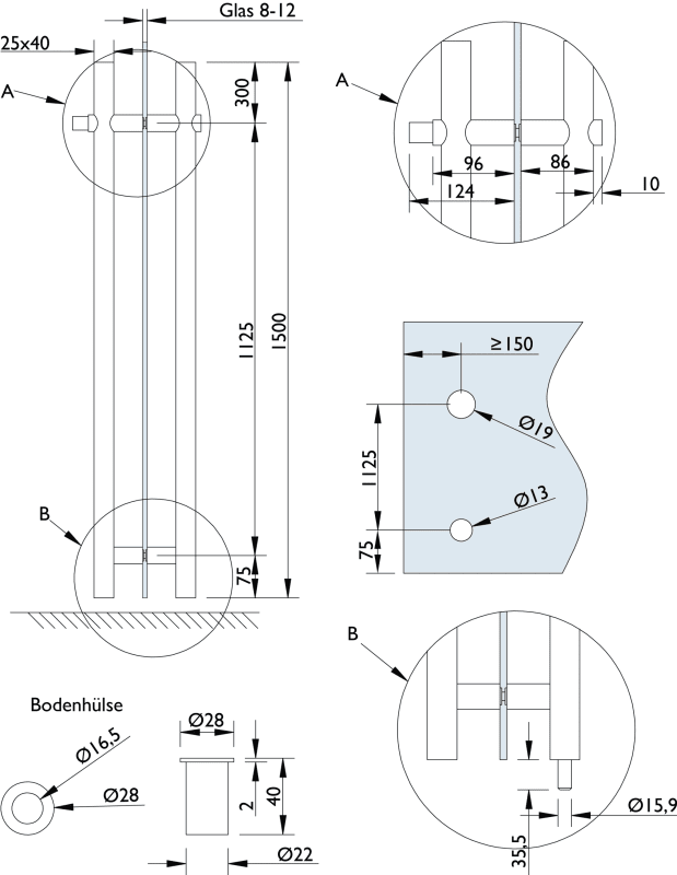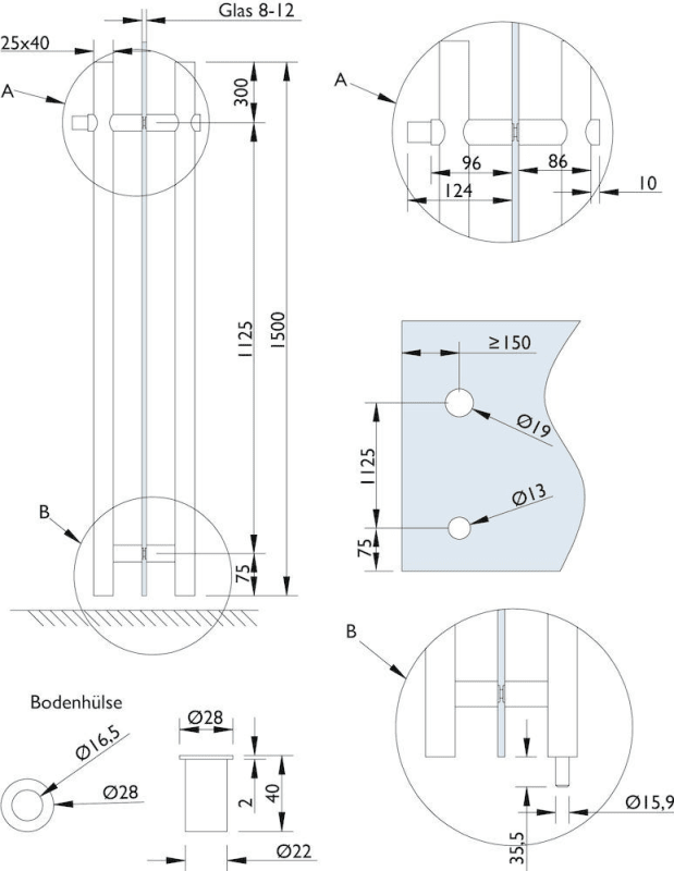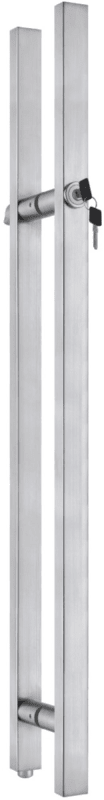 Stoßgriffpaar 8071 ZYL abschließbar, 25 x 38 mm / f. 8/10 mm Glas, Länge 1500 mm / Achsmaß 1125 mm, Innen Knauf / Außen Zylinder, Oberfl. 60 (Edelstahl matt)